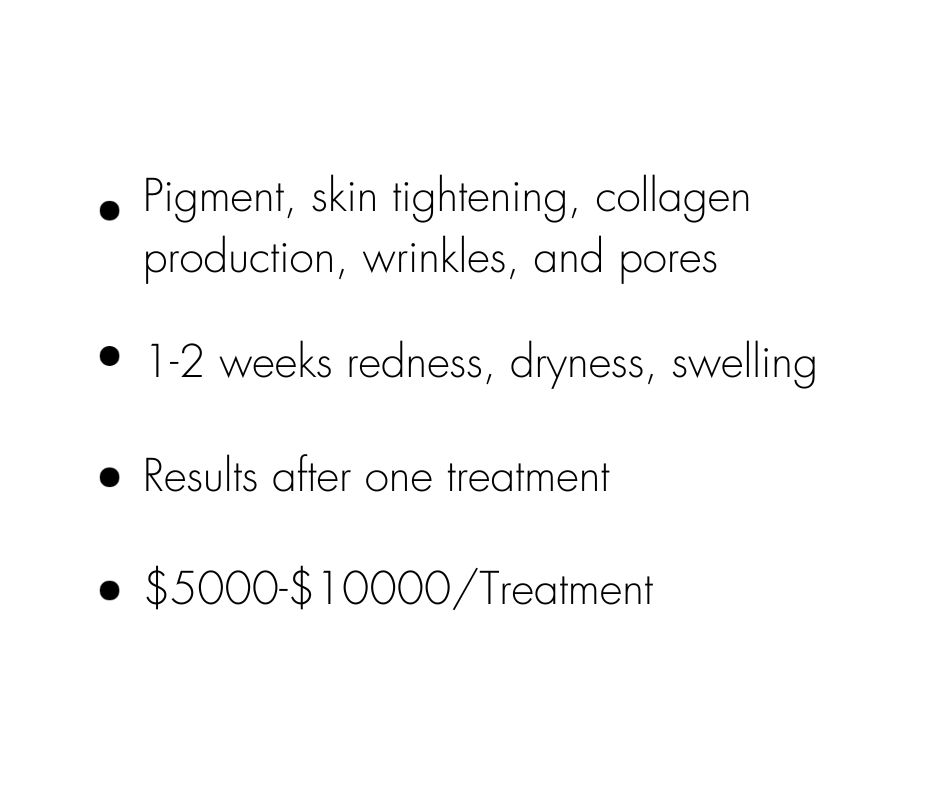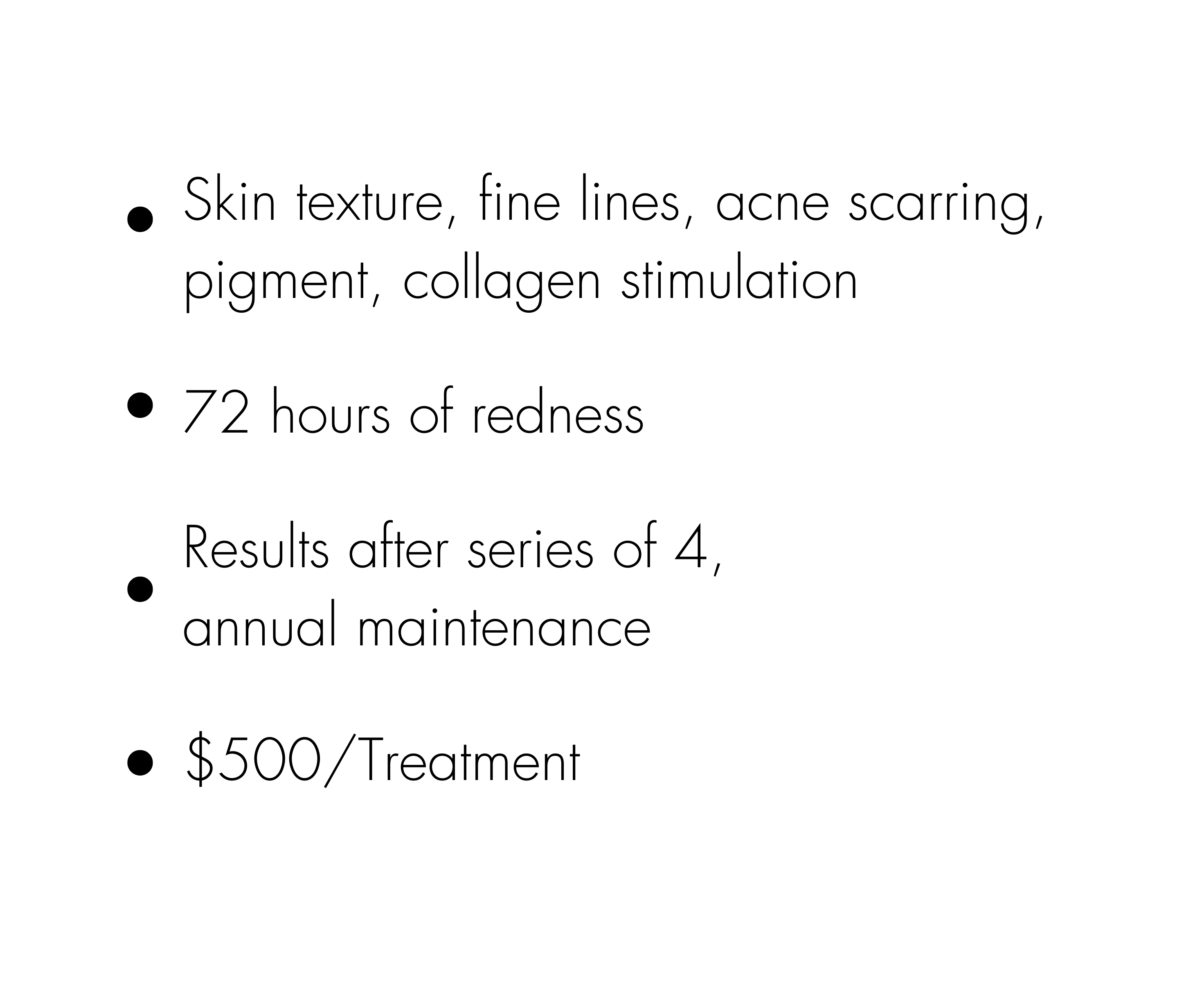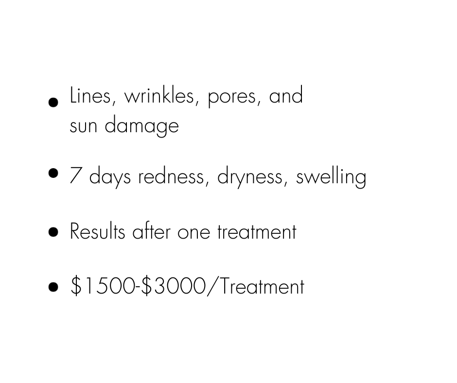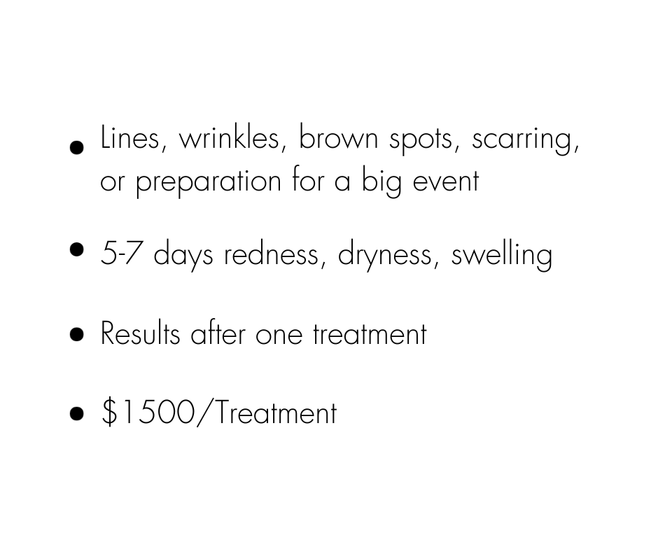 This laser treatment addresses lines, wrinkles, pores, and sun damage in one go. It will leave your skin looking polished and refreshed. Most patients find the procedure comfortable after topical numbing. Expect around 7 days of downtime and results within 2 weeks. The depth of this laser allows for smoothing of fine lines and texture and leaves your skin looking flawless.
